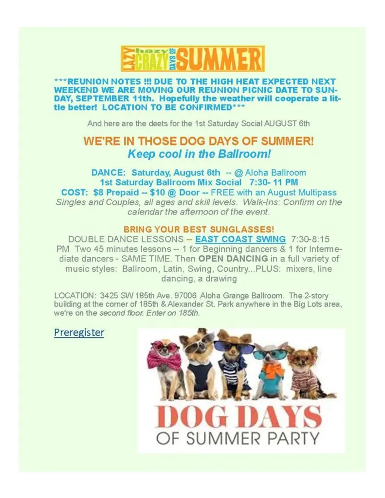 05 Aug Dog Days Dance Social + REUNION RESCHEDULED to 9/11/22